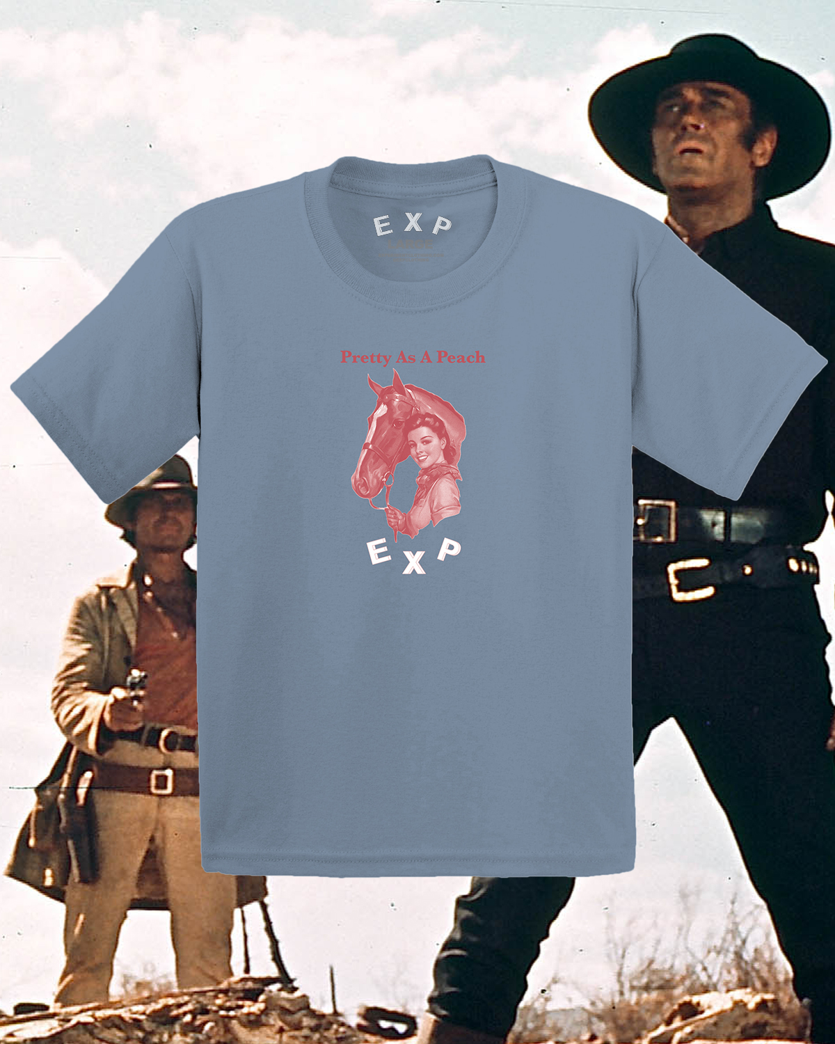 Pretty As A Peach graphic printed on an over dyed denim blue shirt.