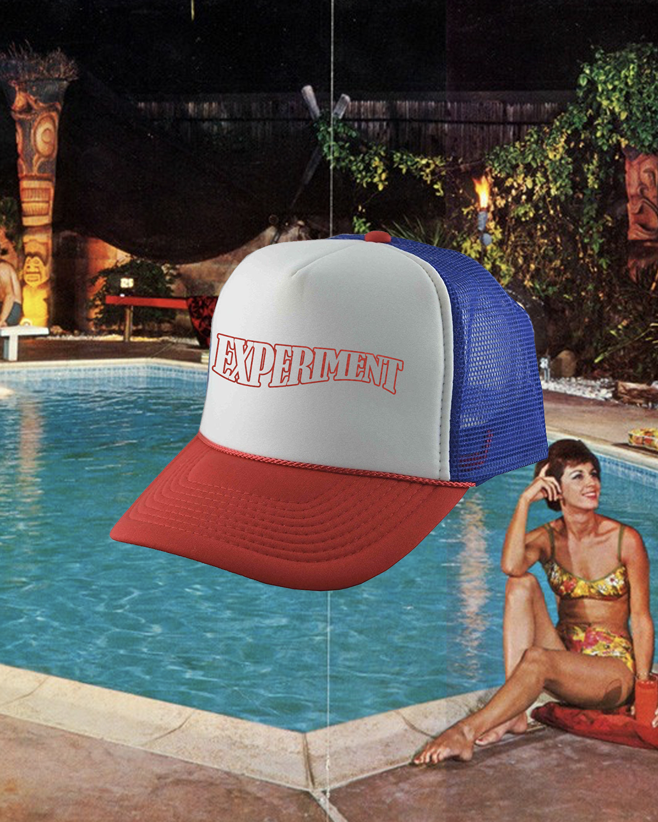 Our Wave Logo embroidered on a red, white and blue trucker hat.