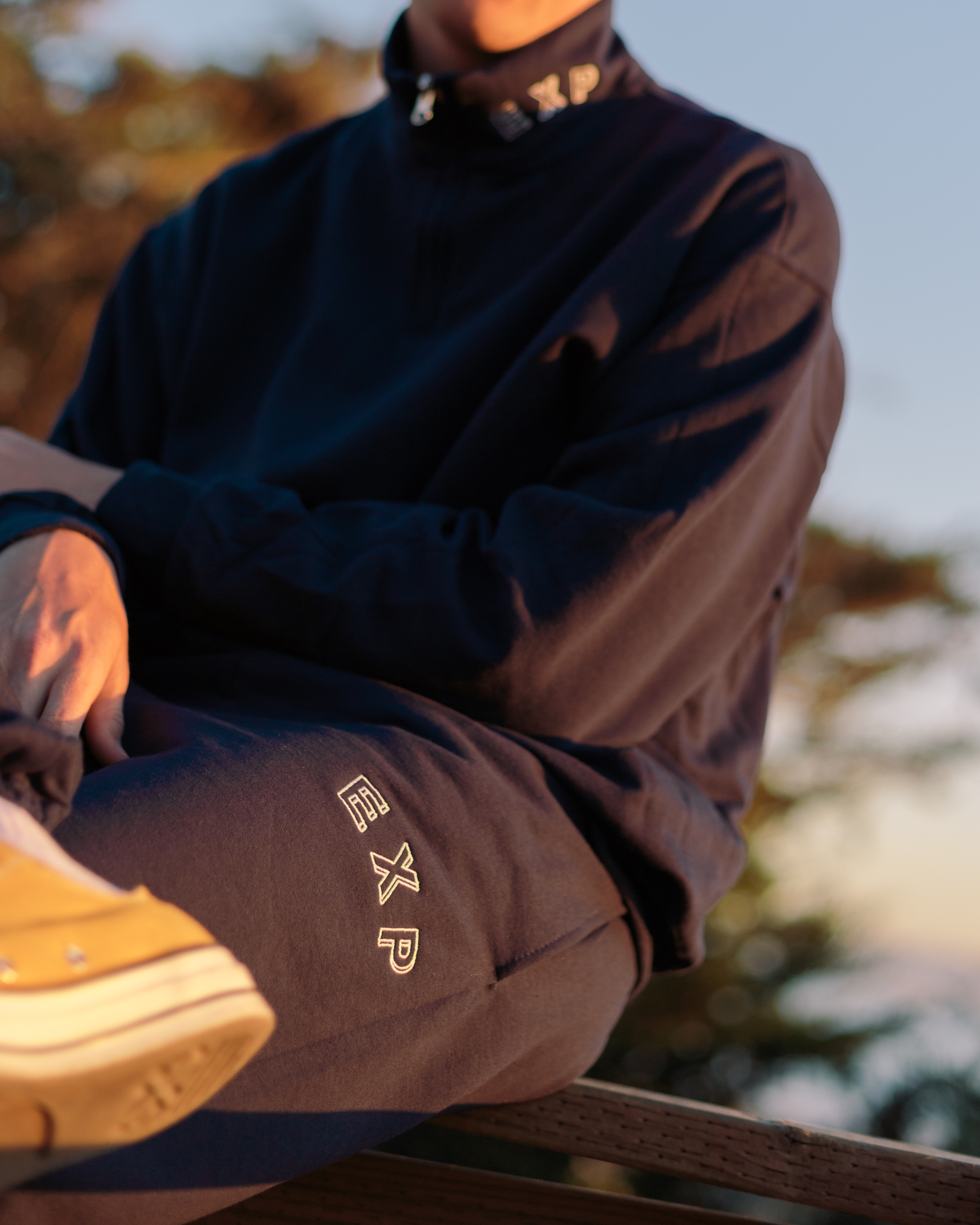 Experiment’s 3D logo embroidered on Navy Blue Sweatpants.